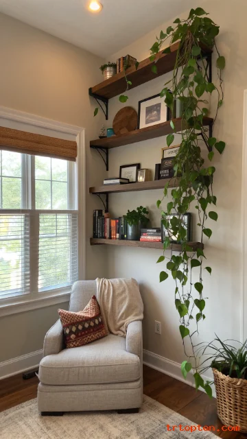 Use a shelf above a reading chair to frame the spot and make it feel special. Keep the pot light so the shelf stays secure.