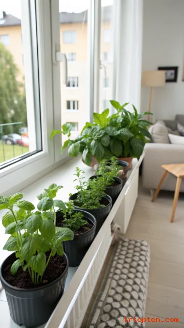 Add a mini herb shelf near the living room window for a fresh twist. Small pots of mint or basil add bright green and function.