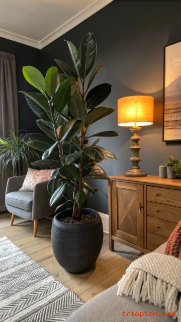 Use a rubber plant to deepen a moody living room with rich green leaves. It looks strong next to darker walls and wood tones.