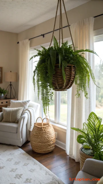 Hang a Boston fern to add softness and a classic indoor garden feel. The fronds create a gentle frame near a window.