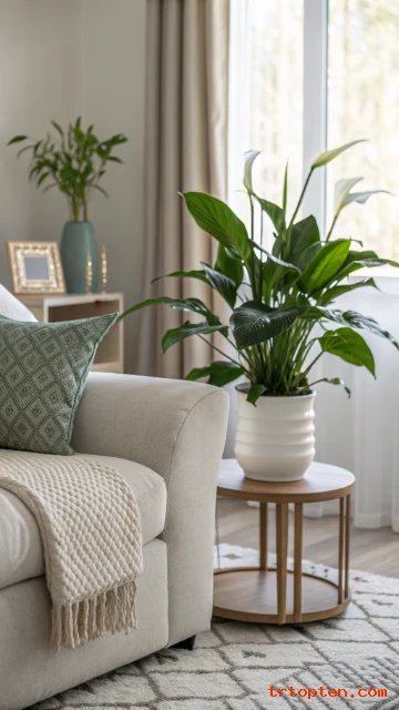 Set a peace lily on a side table to add soft white blooms and gentle curves. It pairs well with rounded decor and lighter rooms.