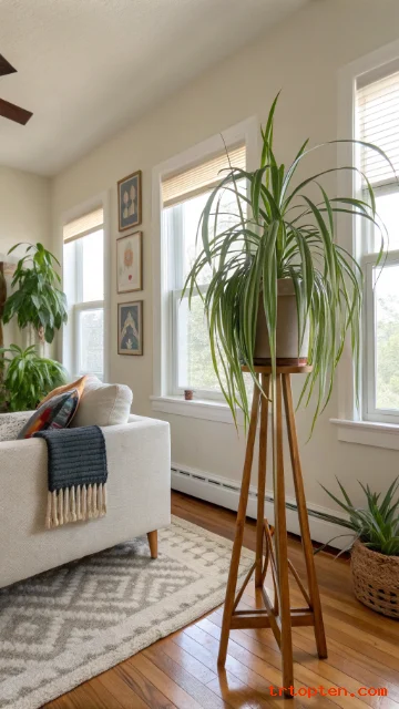 Place a spider plant on a high stand so its arching leaves spill outward. The shape adds bounce and casual charm.