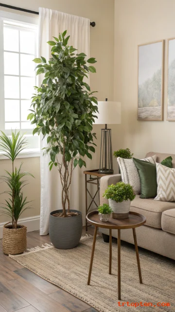 Start with one statement plant, add a trailing plant for movement, and finish with a small tabletop plant for polish. Keep care easy, keep leaves clean, and your living room will look fresh every day.