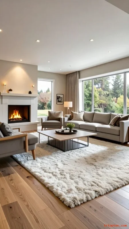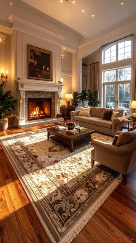 A large rug makes the fireplace seating area feel complete. It also improves comfort and helps with sound.