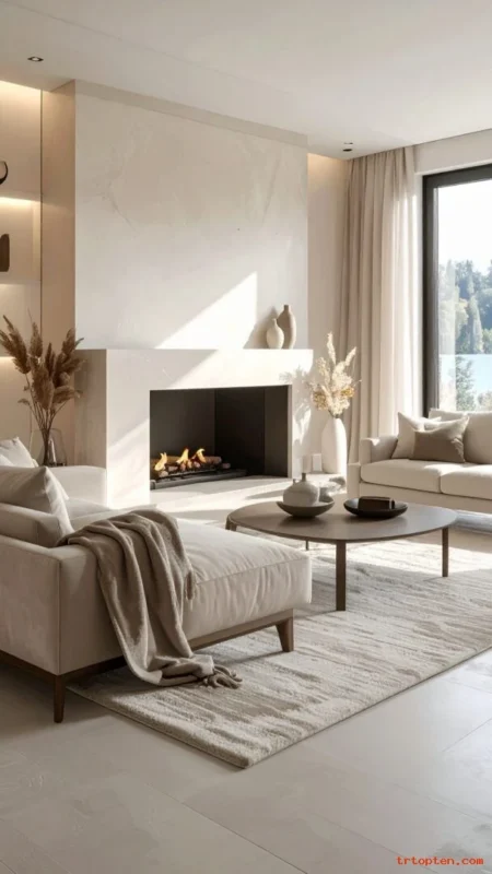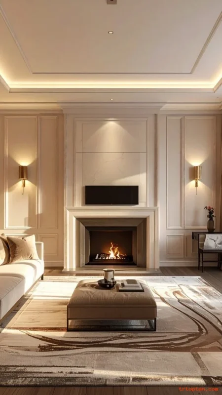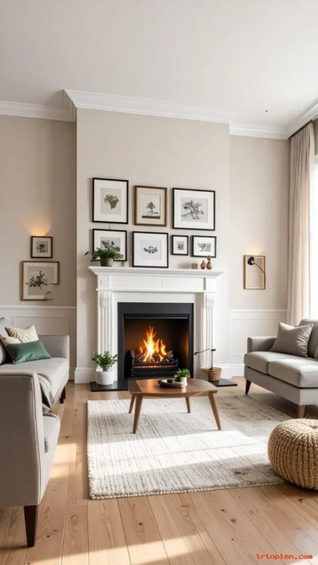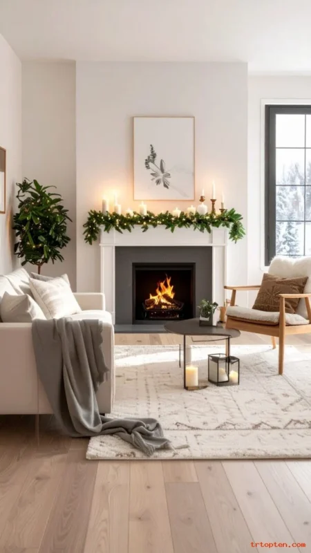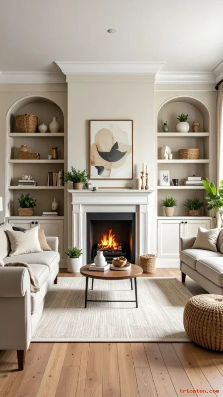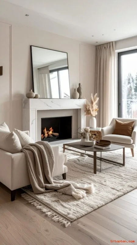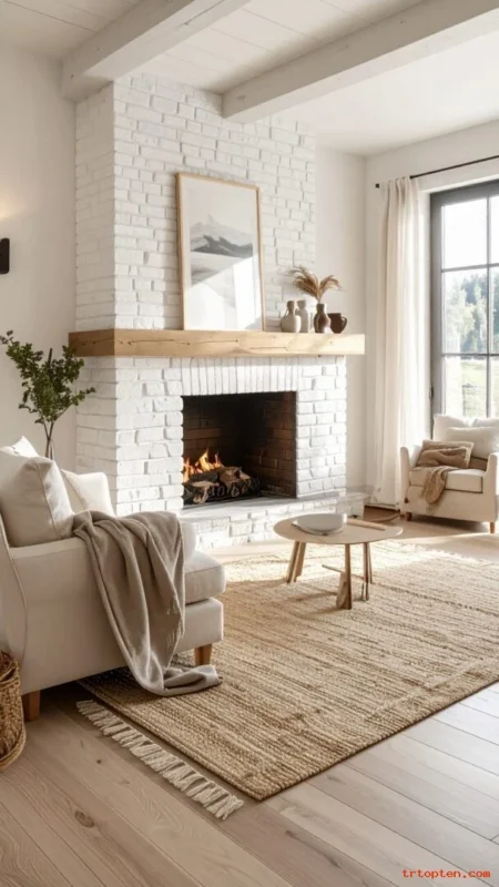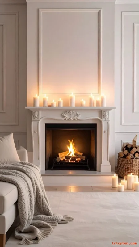 Use soft off-white tones for a natural finish. Keep mantel decor simple with light wood and ceramics. Pair it with linen curtains and warm rugs. This mix keeps the room airy and comfortable.