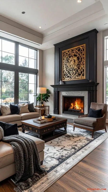 Choose a black fireplace screen, black frames, or matte black hardware. Repeat the black in small doses across the room. Balance the look with warm woods and soft textiles. This keeps the room from feeling cold.