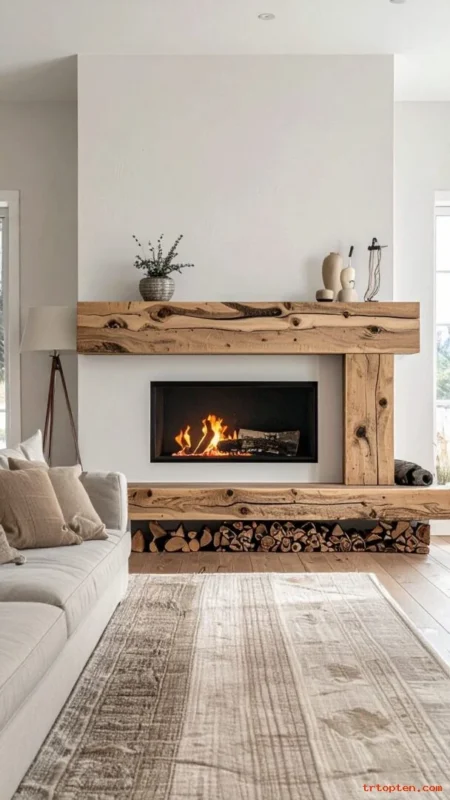 A chunky wood mantel adds instant character and texture. It pairs well with stone, brick, or smooth plaster.