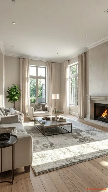 Hang curtains high and wide to make the room feel larger. Choose a textured fabric like linen for a natural look. Keep curtain colors tied to the rug or sofa. This makes the fireplace wall feel integrated, not separate.