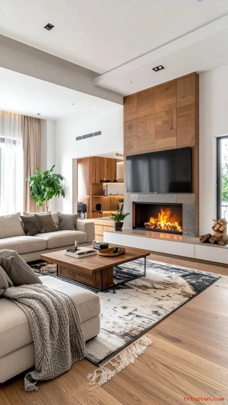 Keep the mantel thin or skip it for a sleek look. Use one large vase or sculpture to keep styling intentional. Add texture elsewhere through rugs, pillows, and curtains. This keeps the room from feeling flat.