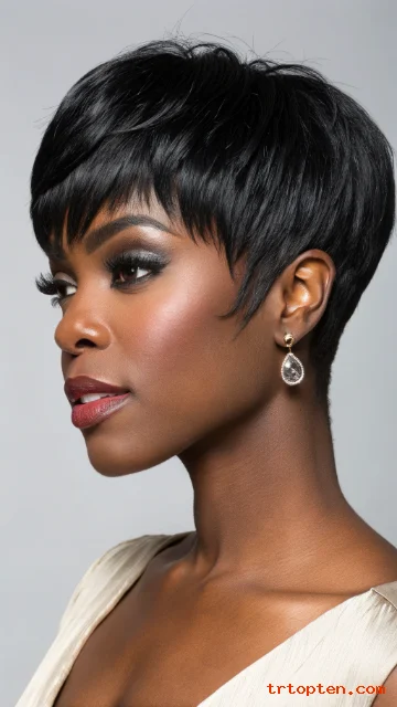 A sculpted pixie creates a smooth shape with a chic finish. Jet black adds depth and makes the style look sleek. This cut fits formal events and everyday outfits.