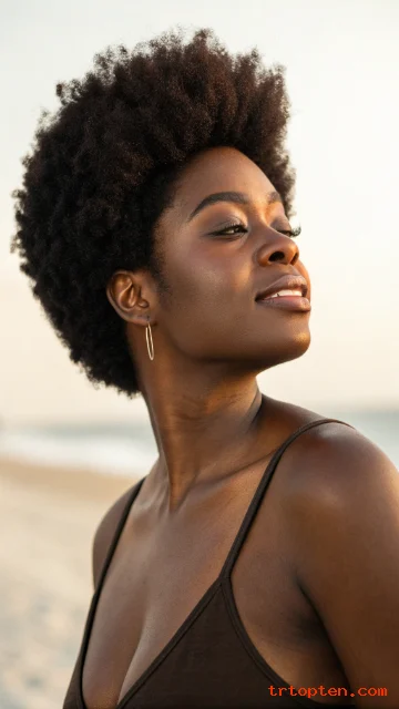 A rounded short afro gives a balanced silhouette that looks classic and modern. The shape creates symmetry and flatters many face types. It also gives you room to play with volume.