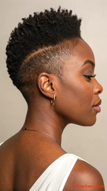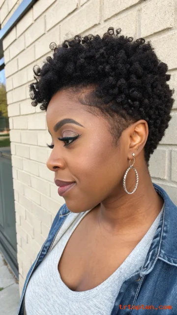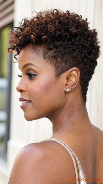 A temple fade keeps the sides clean while curls stay fuller on top. This contrast makes the cut look fresh and stylish. It also works well with bold earrings and makeup.