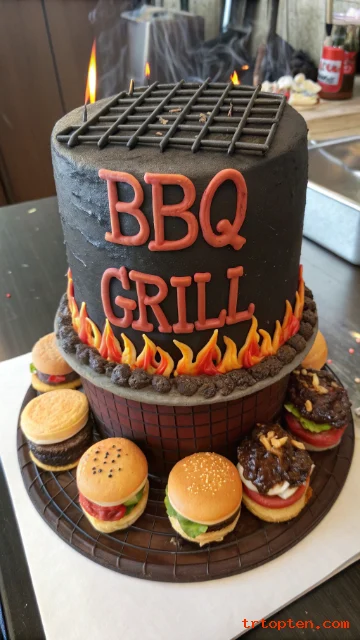 Decorate the top with fondant grill grates and mini burgers. Add flames in red, orange, and yellow for energy. Use dark sides to mimic a smoker.