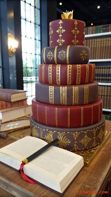 Use stacked book layers or a single cake with book spine wrap. Add small “titles” that match his favorite genres. Use warm tones and gold lines for detail.