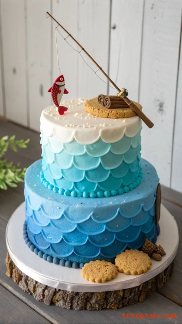 Use blue ombré sides to mimic water and add fondant waves. Place a fish topper and a small fishing rod. Add a name banner like a trophy tag.