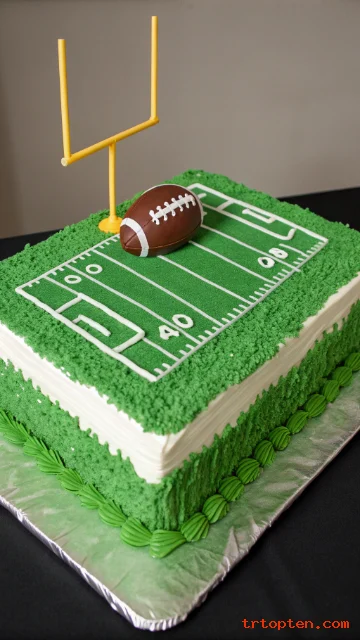Cover the top with green frosting “grass” and white yard lines. Add a goal post topper and a small football on the side. This look feels playful and still neat.