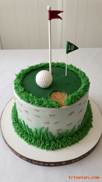 Keep the sides simple in white or light green. Use a small sand trap detail with crushed cookies. Place the flag near the back corner for balance.