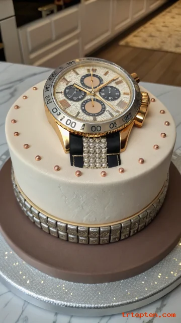 Make the top look like a watch dial with clean markers and hands. Use metallic silver, black, and a small gold accent. This design looks sleek and modern.