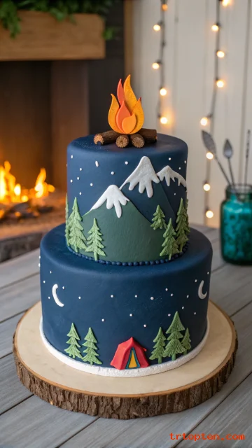 Create a mountain silhouette around the cake using fondant cutouts. Add a small campfire topper with orange glow colors. Use deep blue or forest green for the base.