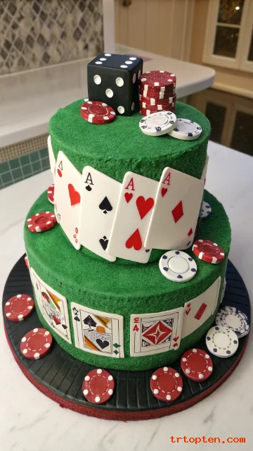 Use green felt texture on top with white line details. Add fondant cards, chips, and dice. Keep the layout balanced with a central stack of chips.