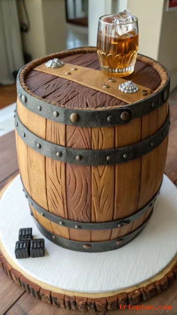 Turn the cake into a mini whiskey barrel using fondant wood panels. Add a small sugar glass and “ice” cubes for a fun bar vibe. Use warm brown tones to sell the barrel look.
