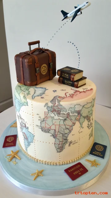 Cover the cake with an edible map print or hand-painted map lines. Add mini suitcase and passport toppers. Use muted colors for a grown-up travel feel.