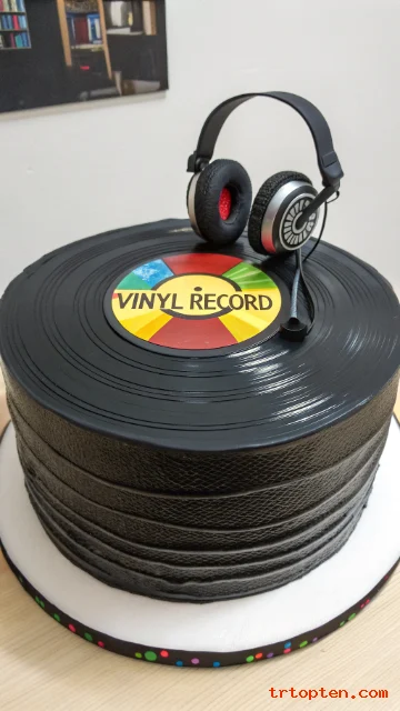 Make the top look like a vinyl record with grooves and a center label. Add a small headphone topper or music notes. Use black with a bright label color.
