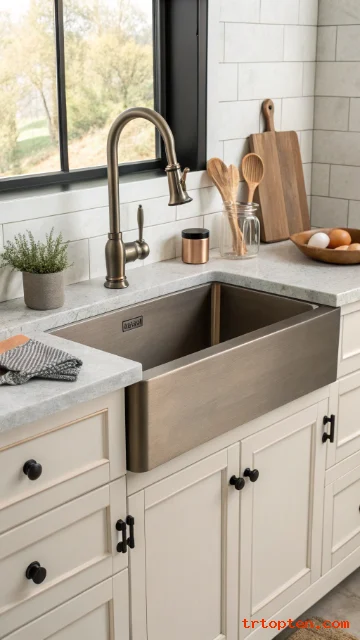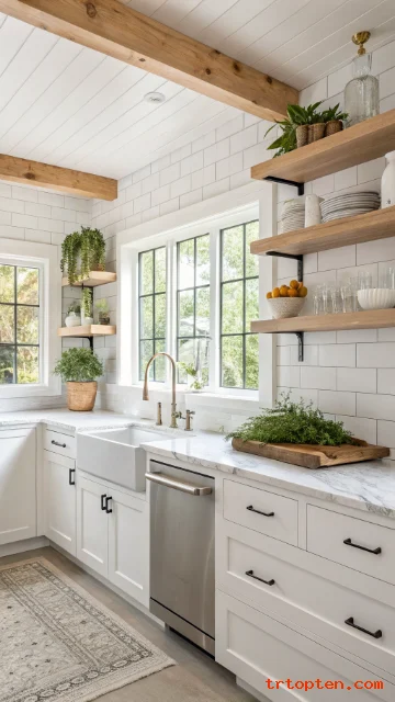 Blend classic charm with modern function. Use shaker-style cabinets, a farmhouse sink, and open shelving. These elements create a timeless, welcoming kitchen. It becomes the heart of the home.