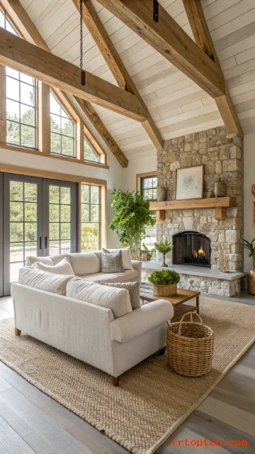 Make your fireplace the heart of the living room. Use simple stone, brick, or painted wood for the surround. Keep the mantel decoration minimal. Let the architecture itself be the main statement.