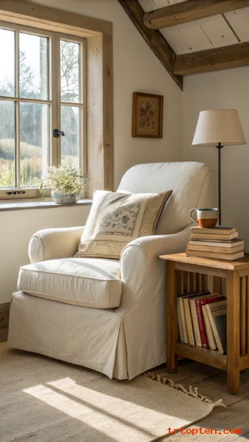 Add personal touches to make it inviting. A soft blanket over the chair and a stack of books on the floor complete the scene. It is a perfect example of modern cottage comfort and simplicity.