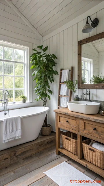 Include vintage-inspired details with a modern twist. A reclaimed wood vanity with a vessel sink looks beautiful. Use modern fixtures and plenty of plush towels. You achieve a spa-like atmosphere at home.