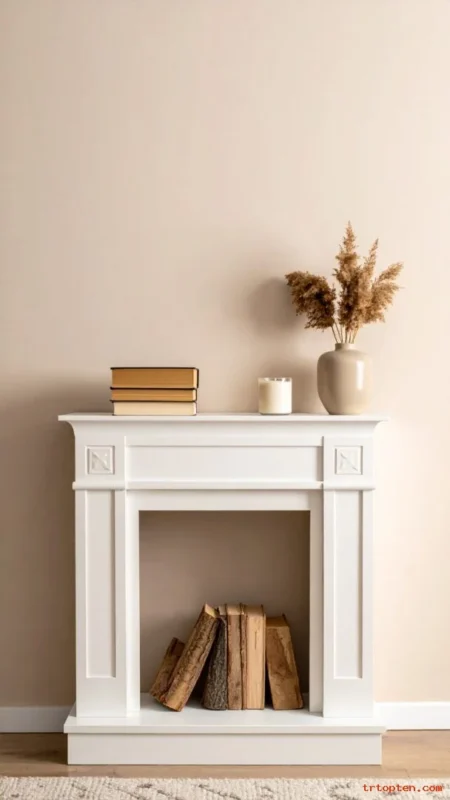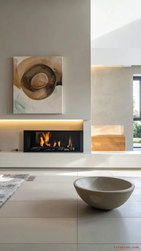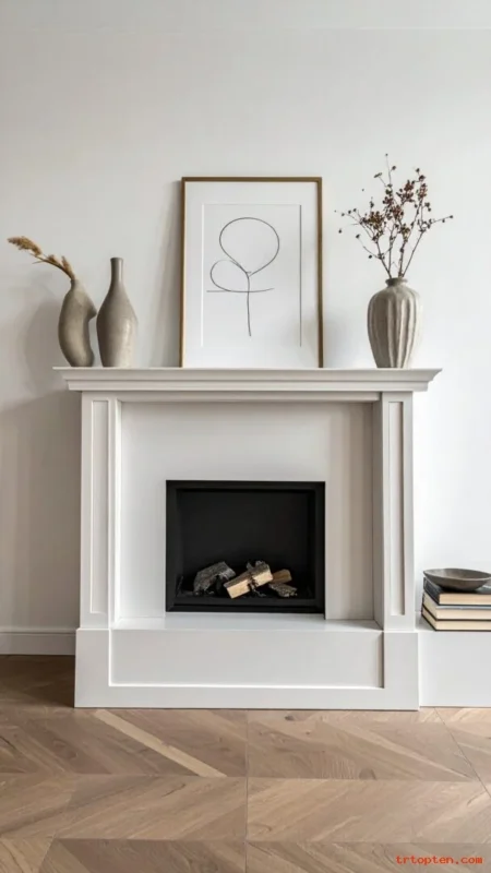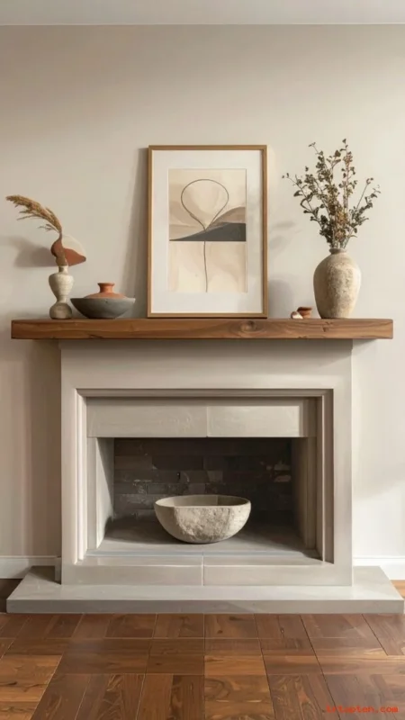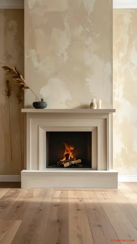 Keep mantel decor simple so the wall texture stays visible. A single artwork and two small objects can be enough. Choose warm white, sand, or light gray for a modern neutral base. This look pairs well with black hardware and natural wood.
