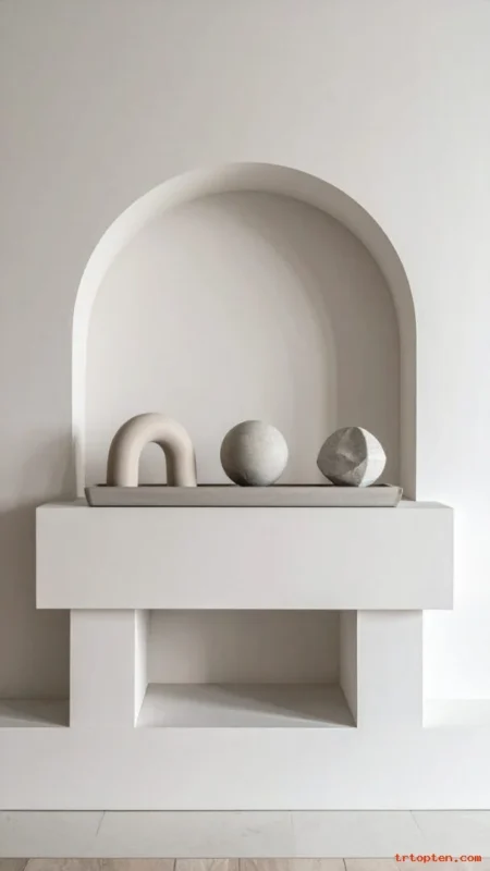 Mix finishes like matte, glossy, and textured stone to add interest. Keep shapes clean, like cylinders, arches, and rectangles. Add one small green plant for a fresh accent that does not break the style. A single stem in a slim vase also works well.