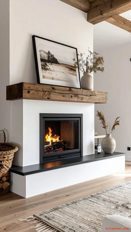 Use a simple wood beam mantel and pair it with black metal accents. Add a neutral vase with dried stems for softness. Limit rustic elements to one or two pieces. This keeps the look modern first.
