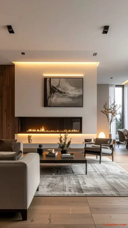Use a textured wall finish behind the fireplace to add modern depth. Plaster or limewash gives a soft, organic look that still feels current.