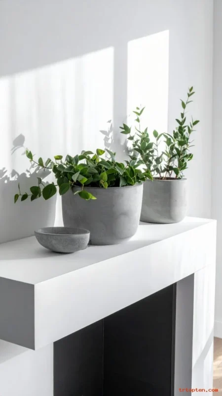 Keep the pots matte and minimal in white, black, or concrete. Avoid overly decorative planters so the look stays modern. Balance the plant with one solid object like a candle or a stone bowl. This keeps the mantel from feeling too soft.