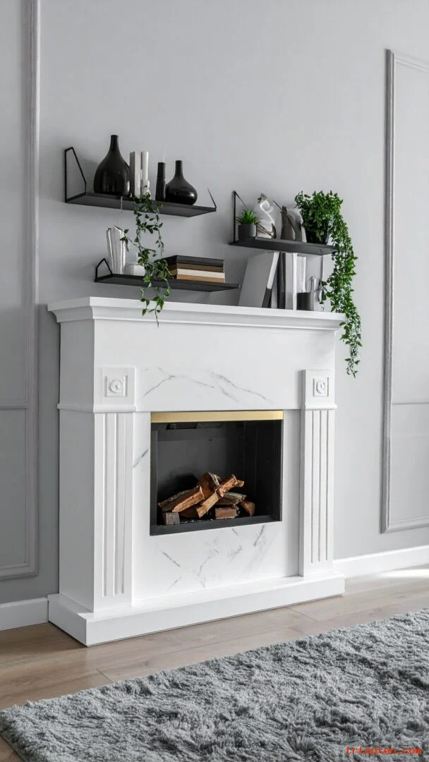 Install one or two floating shelves above the mantel for a modern layered wall. The shelves give you room for decor without crowding the mantel itself.
