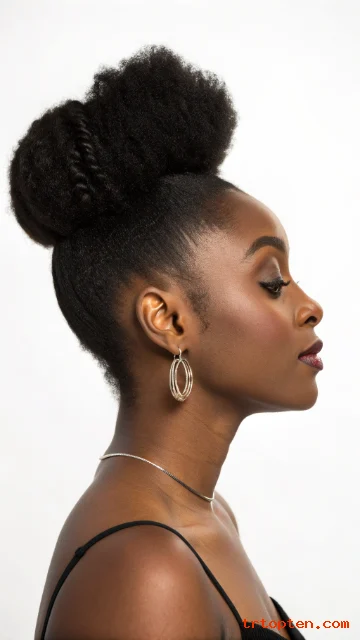 An afro puff ponytail gives a cute shape and keeps hair controlled. It shows texture while still feeling neat.