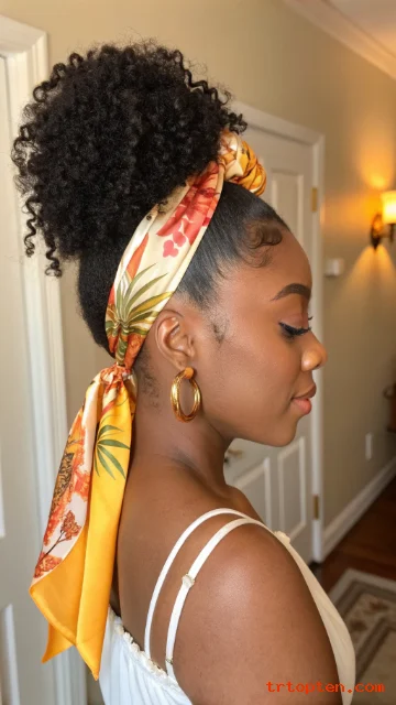 Smooth the front with leave-in and gel, then secure the puff at the nape. Add a satin scarf for ten minutes to set the front and reduce frizz.