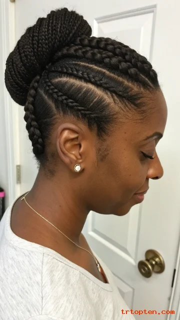 Cornrows can form an updo that lasts and protects. Natural ends soften the look and add texture.