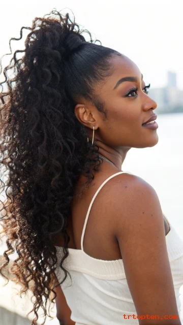 Gather hair into a ponytail puff and define the curls with leave-in and gel. Use a satin scrunchie to reduce breakage and keep comfort.