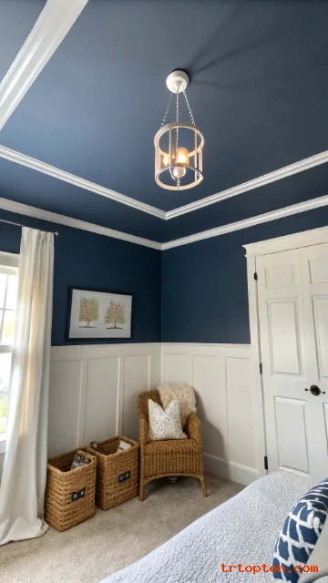 Paint the ceiling navy and keep the walls light to create a tucked-in effect. The dark ceiling can make a tall room feel more comfortable. Use bright white trim so edges look sharp.