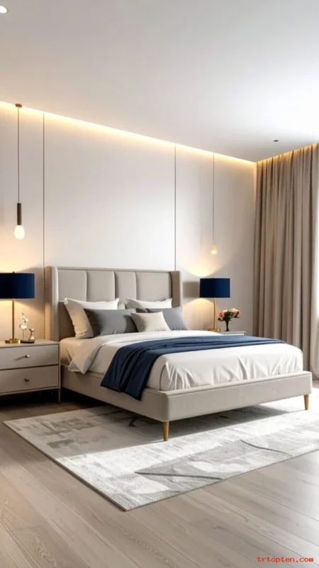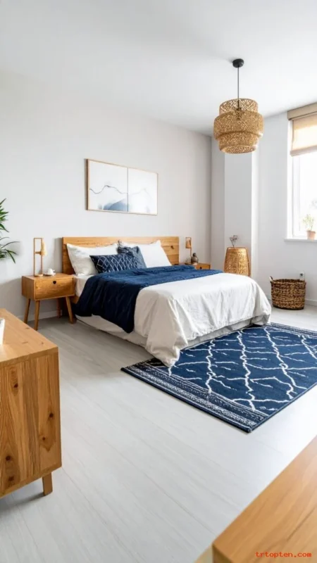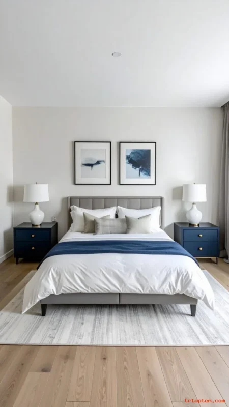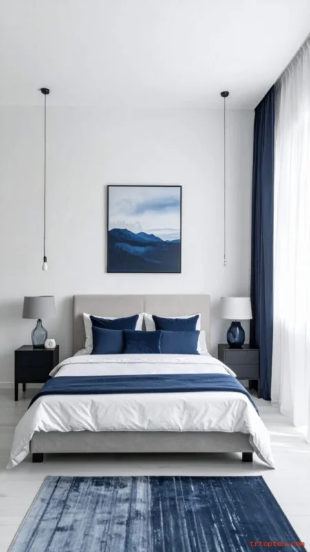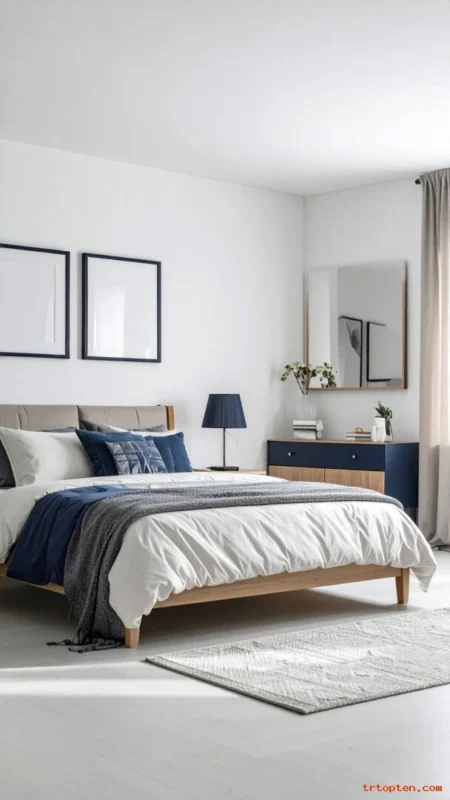 Use simple decor in white ceramics to keep balance. Add a navy throw or navy headboard for the main anchor. Keep lighting warm and soft.