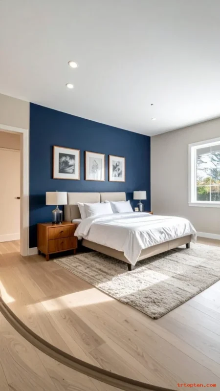 Paint one wall navy and keep the other walls light for contrast. Place your bed on the navy wall so the room feels anchored and calm. Add simple white bedding so the color looks crisp, not heavy.