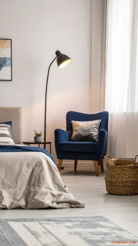 Create a small reading nook with a navy chair or navy cushion. Add a floor lamp and a small side table. This makes the bedroom feel more useful and cozy.
