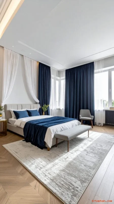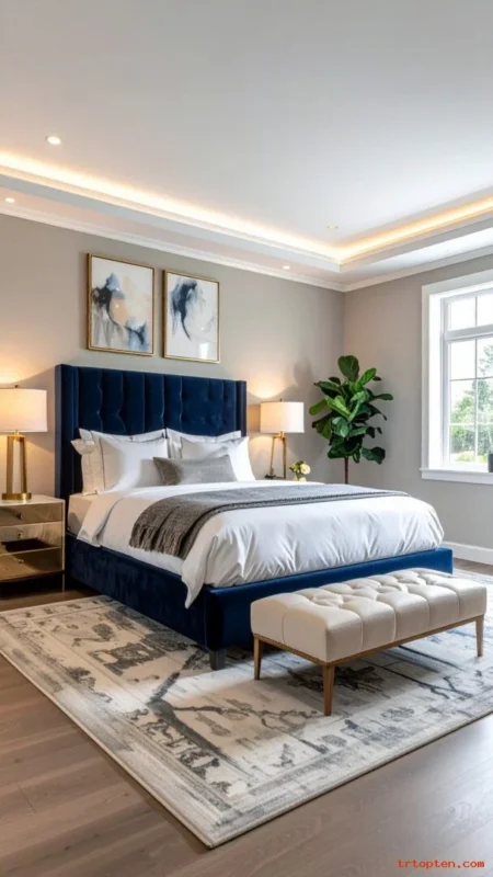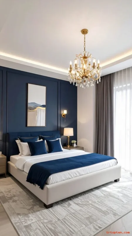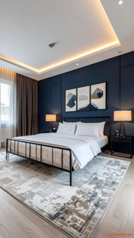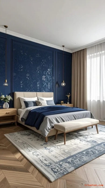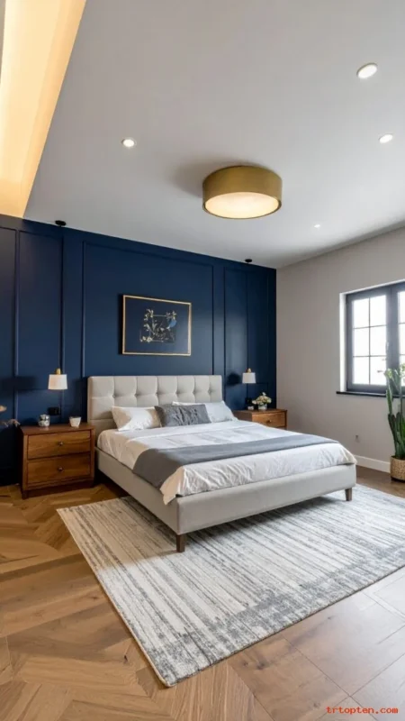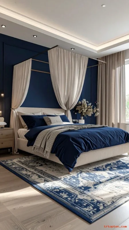 Match navy with a rug border or pillow. Add warm wood nightstands to soften the look. Use a light ceiling to keep the room open.