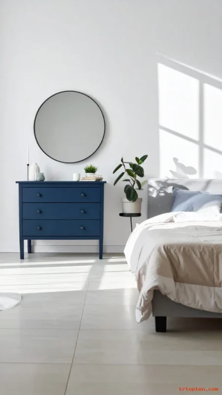 Place a navy dresser as a statement piece. Navy furniture can look bold while staying classic. Keep the top styling light and simple.