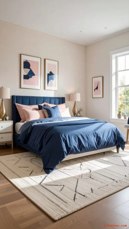 Use large navy-toned art above the bed. Art can bring navy into the room without heavy color blocks. Choose abstract, coastal, or botanical styles.