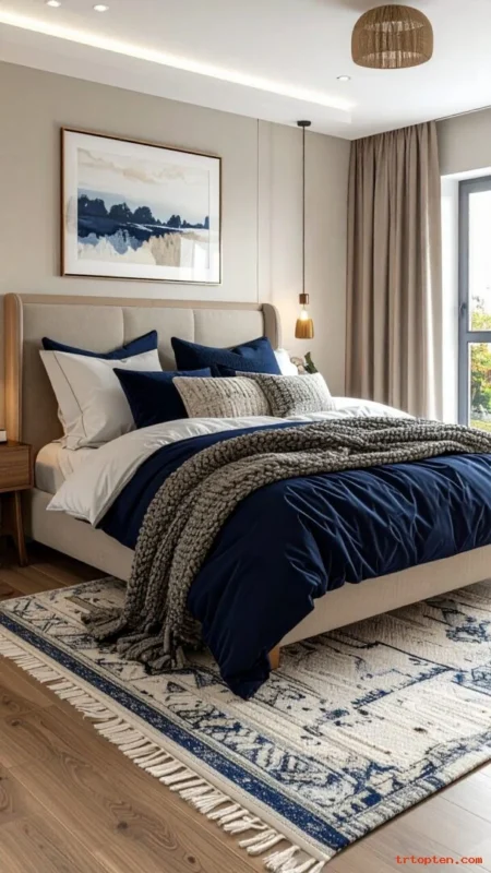 Keep pillows in a mix of navy, cream, and light gray. Use a neutral headboard if the bedding is bold. Add a simple rug to soften the look.