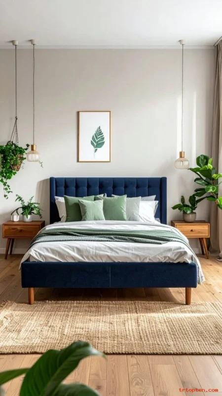Paint or buy navy nightstands for a strong accent. This adds color without committing to navy walls. Keep the rest of the furniture neutral for balance.